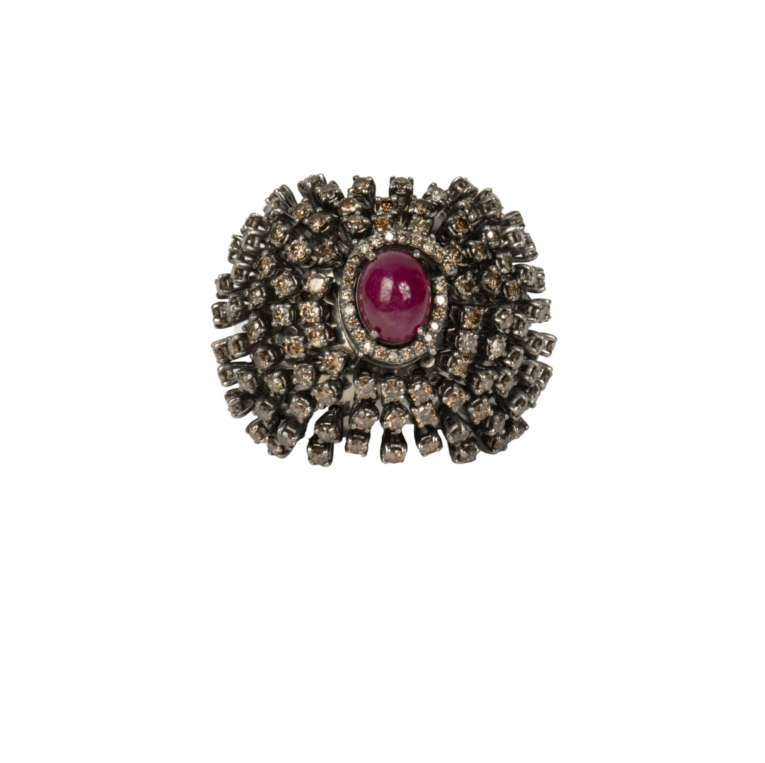 Uma verdadeira joia de impacto e personalidade. Este anel exibe um exuberante rubi central em lapidação cabochão, envolto por camadas de pequenos diamantes que criam um efeito visual único e luminoso. Seu acabamento escurecido traz um charme vintage e um toque de ousadia, ideal para quem valoriza joias com estilo marcante e atemporal.