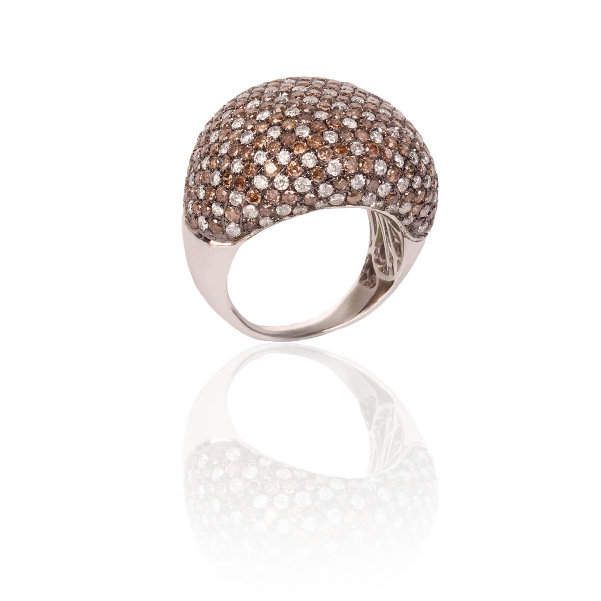 Este anel exuberante é uma verdadeira celebração do brilho e da sofisticação. Confeccionado em ouro branco 18K, ele é inteiramente cravejado com diamantes cognac e diamantes brancos em pavê, criando uma superfície rica em textura e luminosidade. Seu formato abaulado traz volume e elegância, tornando-o uma peça impactante e atemporal.