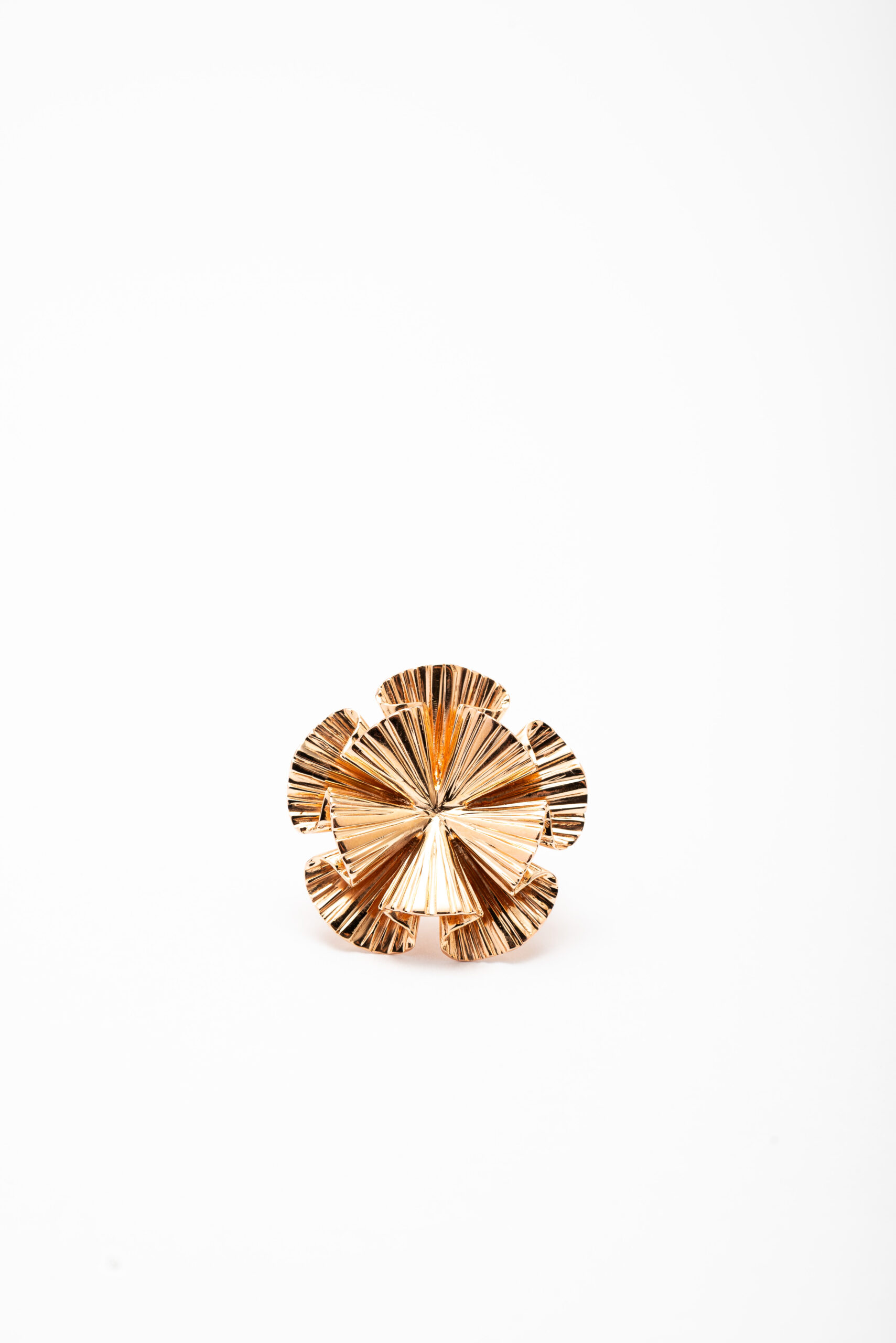 O Anel “Jalapão” é uma joia autoral que celebra a força e a beleza da natureza brasileira. Seu topo apresenta uma exuberante flor em duas camadas sobrepostas, com textura geométrica em alto relevo que confere brilho, profundidade e movimento à peça. Cada pétala é desenhada com recortes sutis e linhas marcantes que irradiam do centro, como raios de sol — uma homenagem visual à rusticidade e ao esplendor do cerrado.