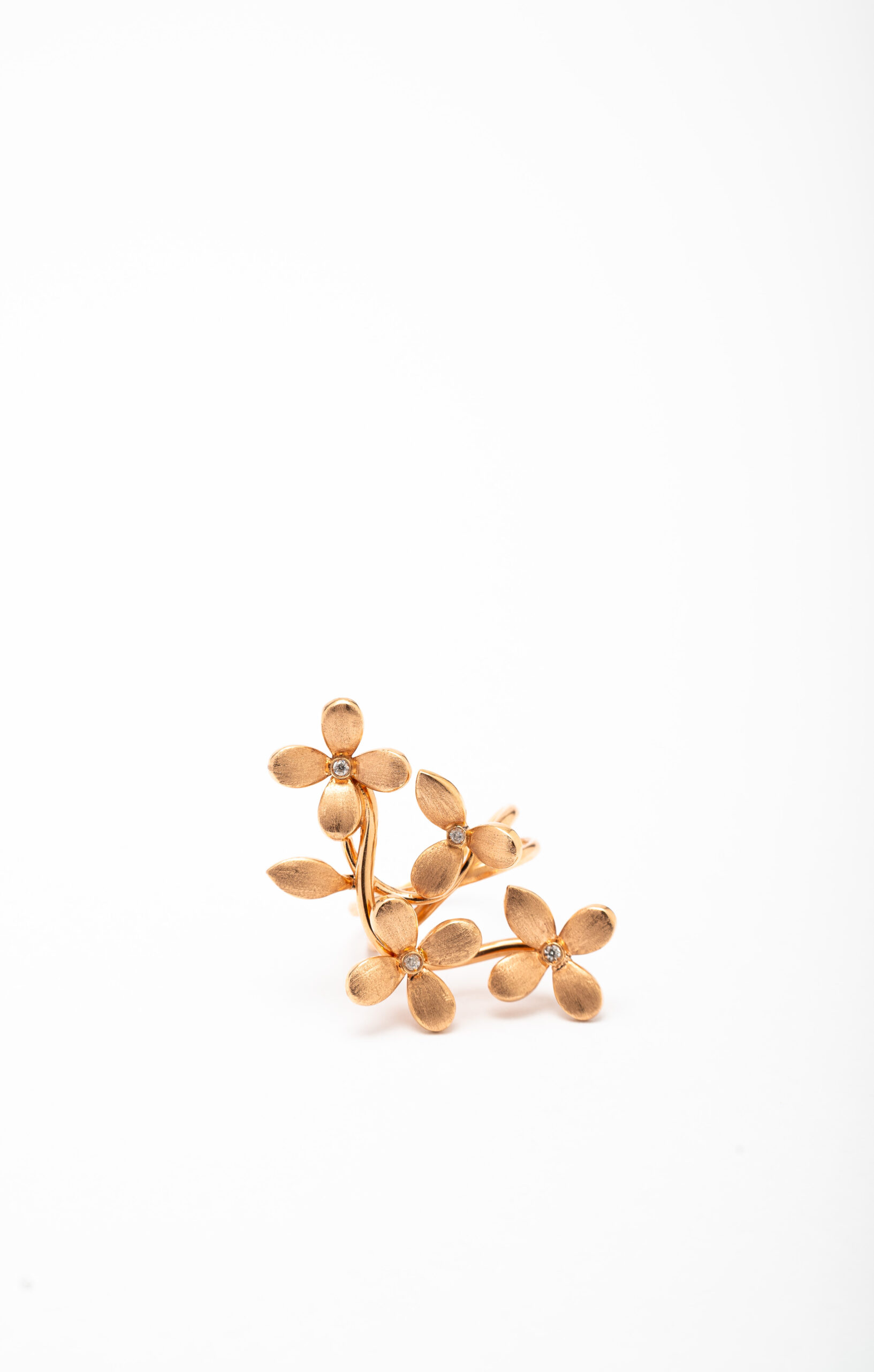 Inspirado nos jardins poéticos do pintor Claude Monet, este anel celebra a delicadeza da natureza em sua forma mais artística. Forjado em ouro rosé 18K, a peça traz uma composição fluida de pequenas flores com acabamento acetinado, cada uma com um diamante natural no centro — como gotas de orvalho ao amanhecer.