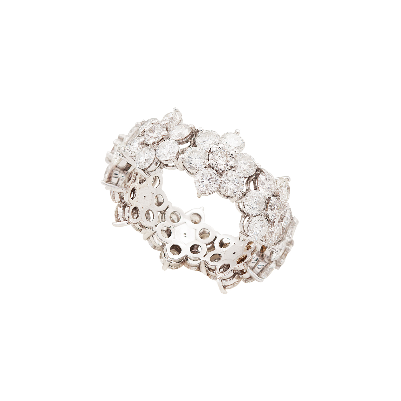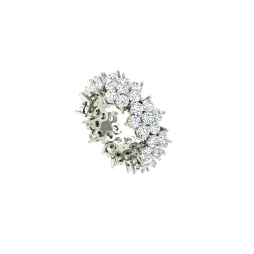 Uma joia que floresce em brilho. Esta aliança inteira apresenta um design sofisticado em forma de flores, totalmente cravadas com 56 brilhantes redondos de 3,00 mm. Cada flor é composta por diamantes que se unem em uma composição simétrica e radiante, criando um efeito visual impactante e ao mesmo tempo delicado.