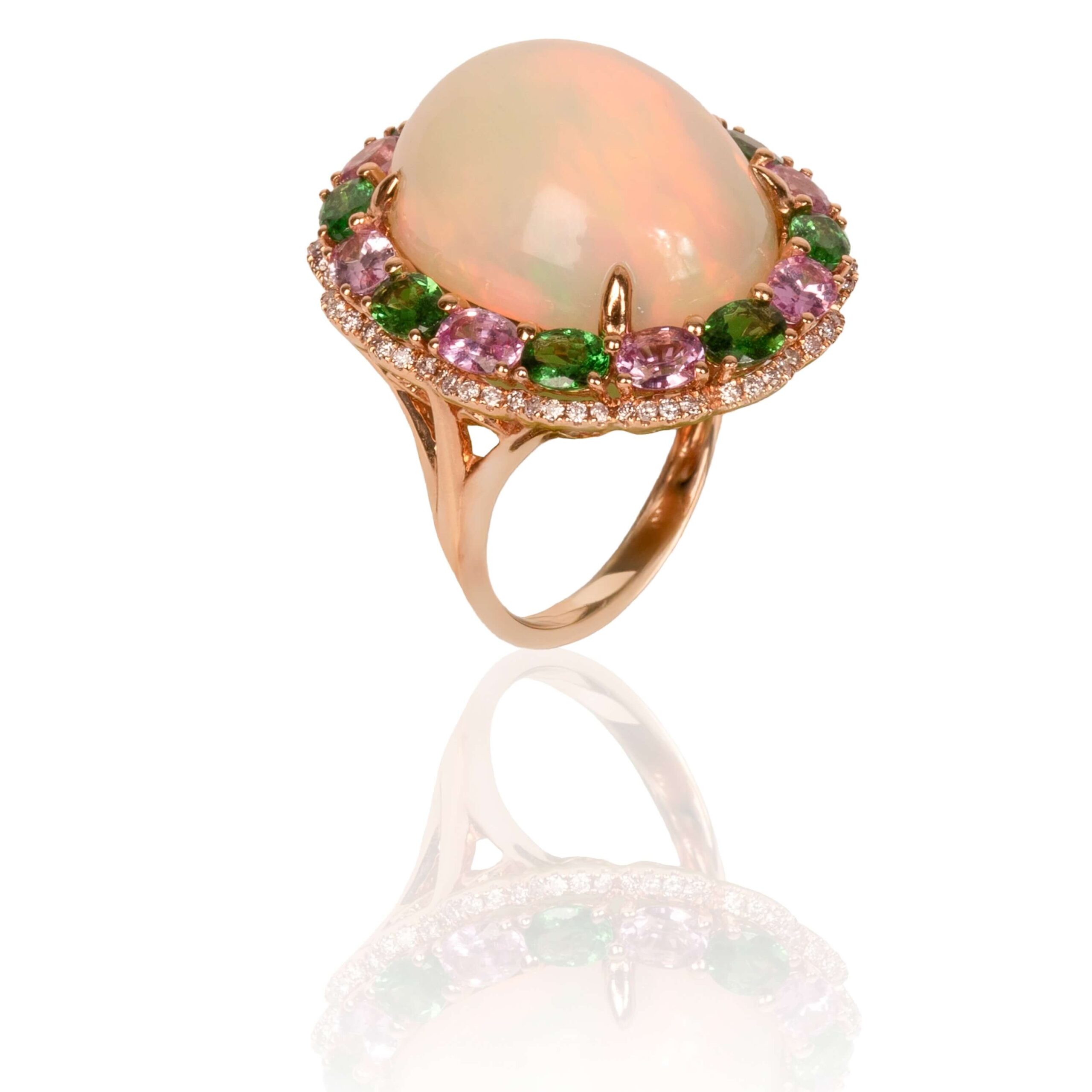 Deslumbre-se com a sofisticação desta deslumbrante joia em ouro rosé, protagonizada por um majestoso opala cabochão central. O opala é elegantemente contornado por um delicado halo de gemas multicoloridas — safiras rosas e tsavoritas verdes — que acentuam seu brilho natural e proporcionam um contraste vibrante e harmonioso. Pequenos diamantes cravejados ao redor do aro adicionam um toque extra de luxo e refinamento. Uma peça única, perfeita para ocasiões especiais e coleções exclusivas.