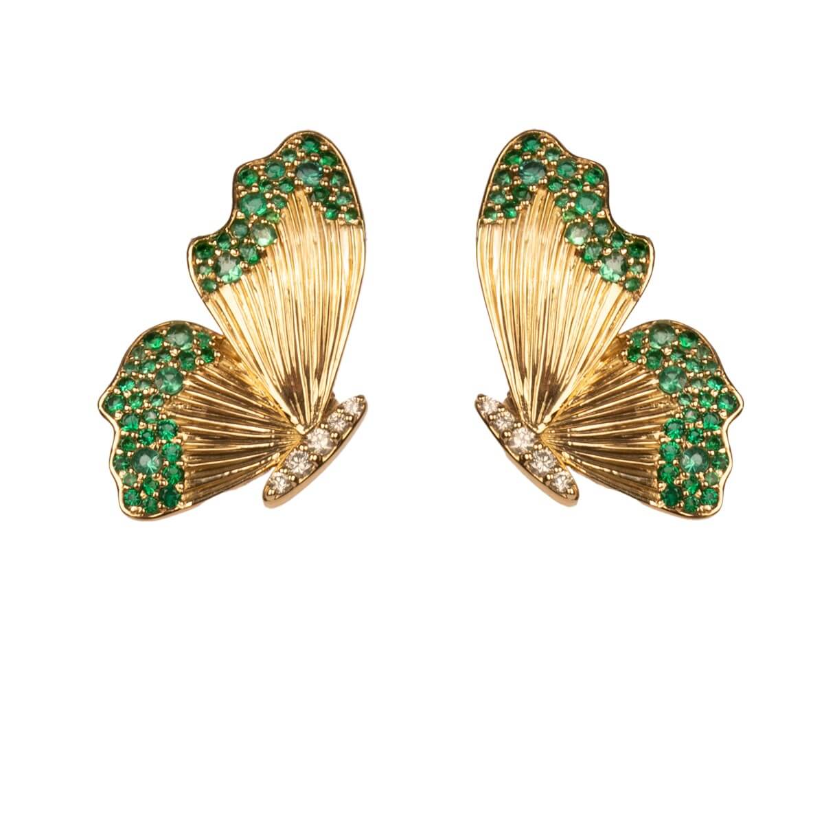 Delicadeza, movimento e sofisticação. O Brinco Butterfly com Esmeraldas e Brilhantes da coleção Butterfly traduz a liberdade e a elegância em cada curva. Em formato de borboleta estilizada, essa peça é composta por esmeraldas naturais e brilhantes cuidadosamente cravados, que realçam os detalhes em ouro 18k texturizado com ranhuras esculpidas à mão.