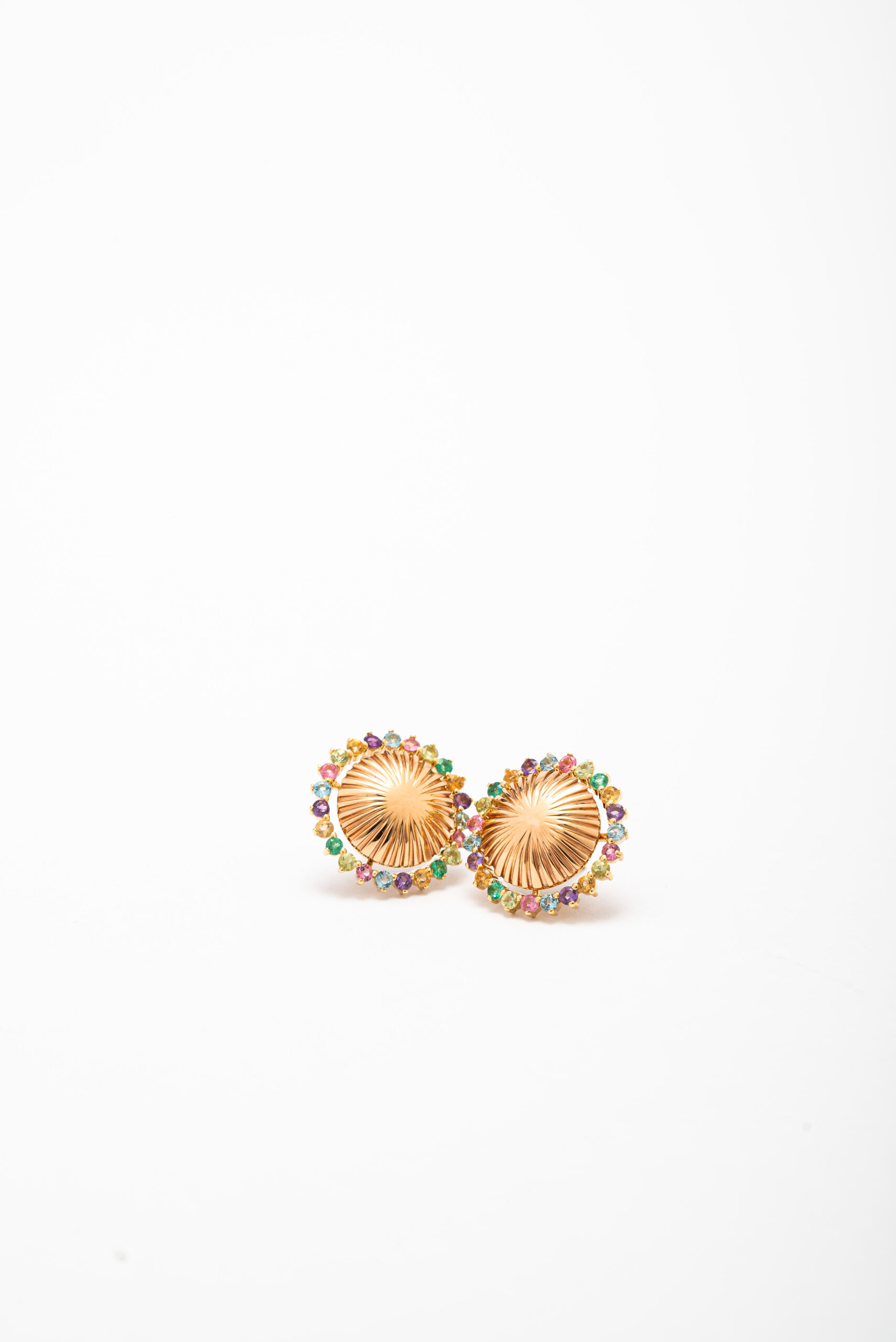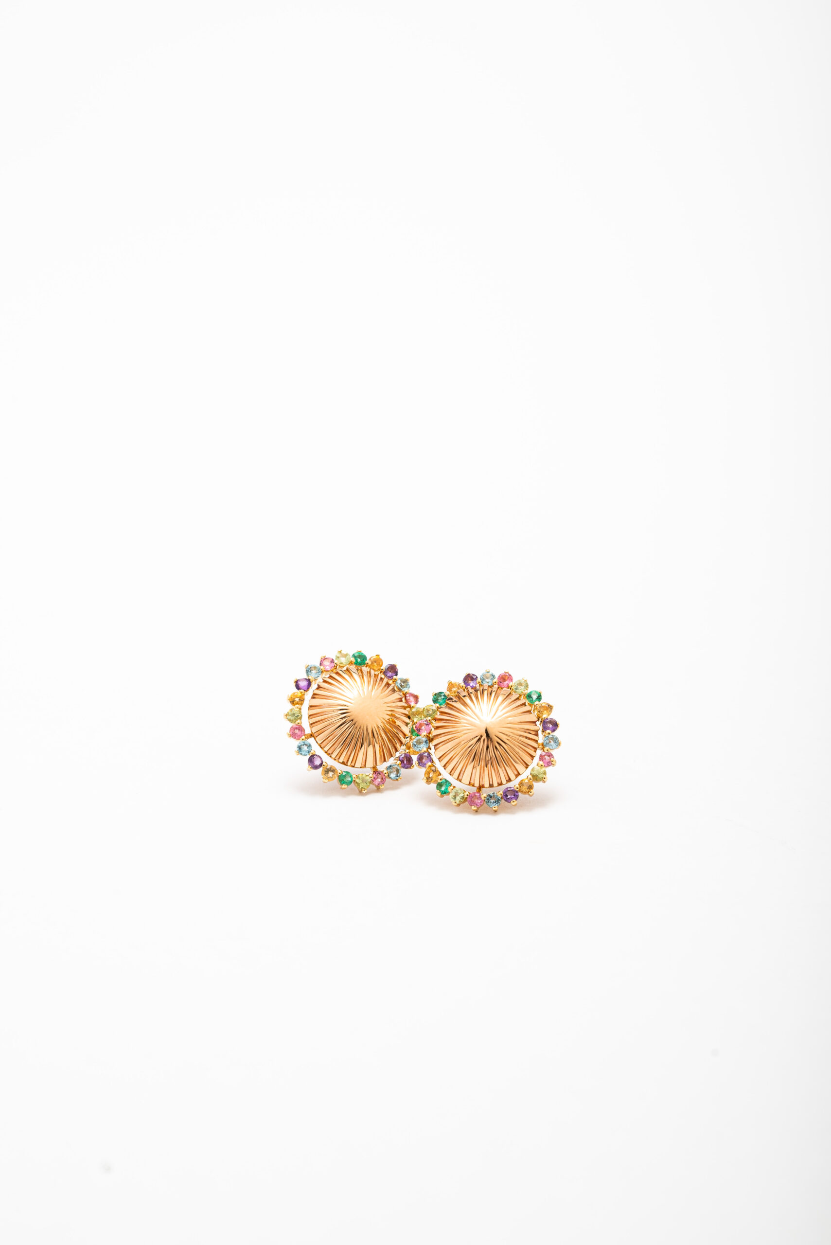 Um verdadeiro tributo à luz, à cor e à alegria. Este brinco em formato de mandala apresenta um centro com textura radiante em ouro amarelo 18K, cercado por uma delicada moldura de safiras multicoloridas. A composição reflete a harmonia entre energia e elegância, traduzindo-se em uma peça sofisticada, vibrante e atemporal.