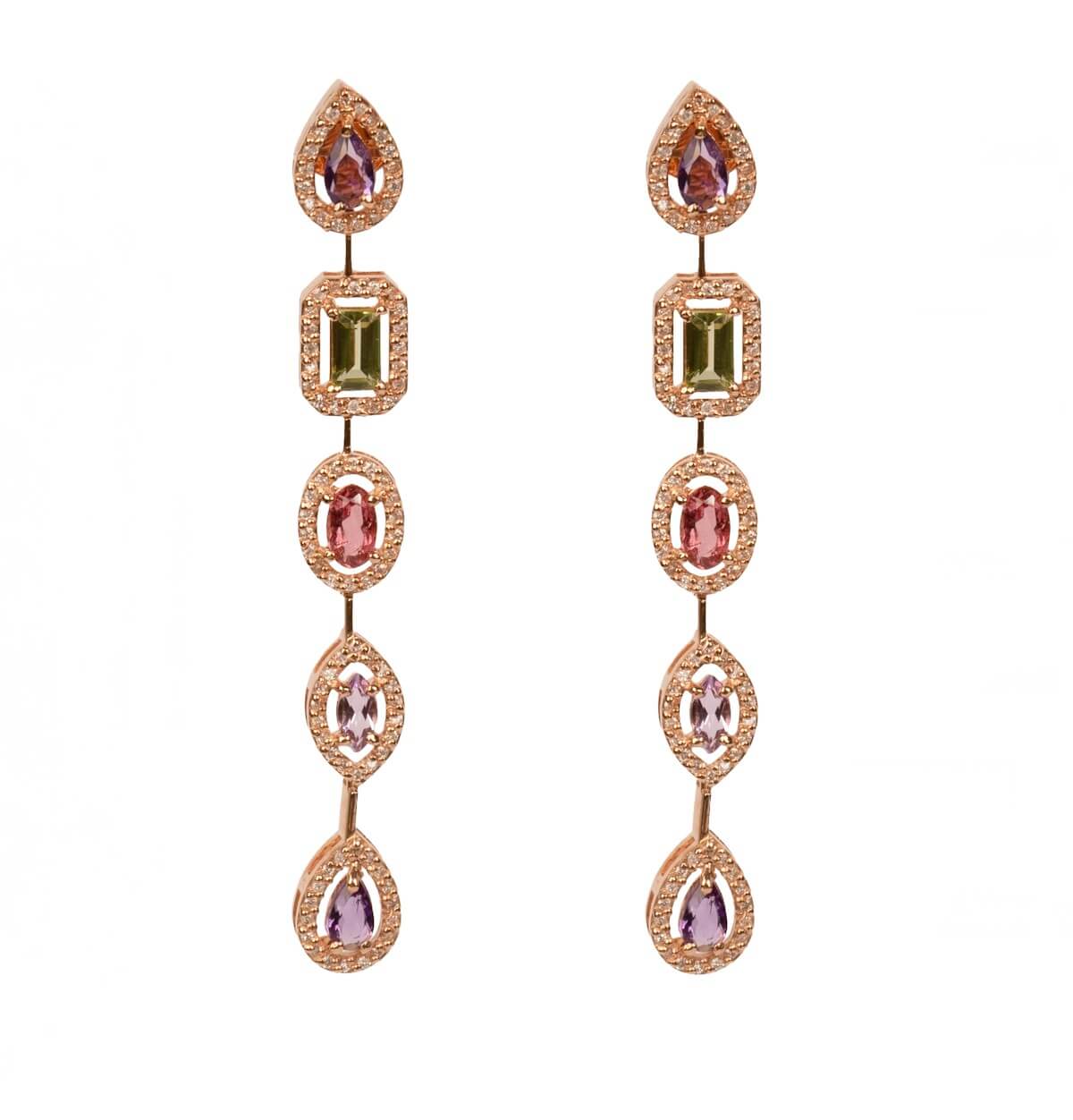 Uma celebração à cor e à elegância. Este brinco estilo riviera combina formas geométricas e uma composição vibrante de gemas multicoloridas, criando um efeito visual sofisticado e contemporâneo.