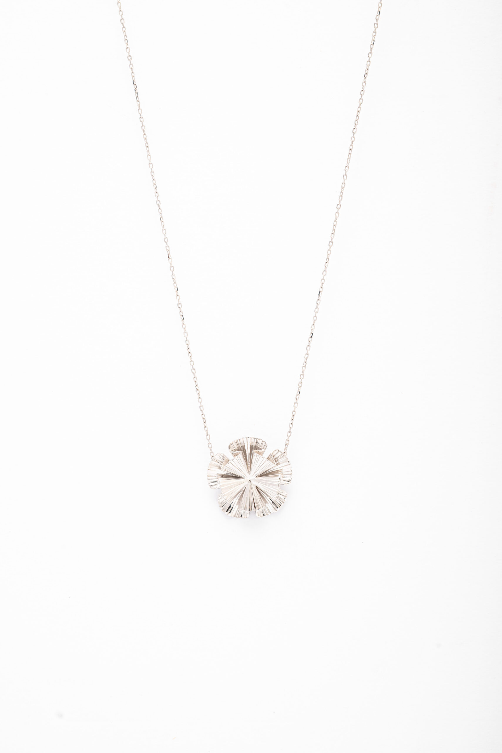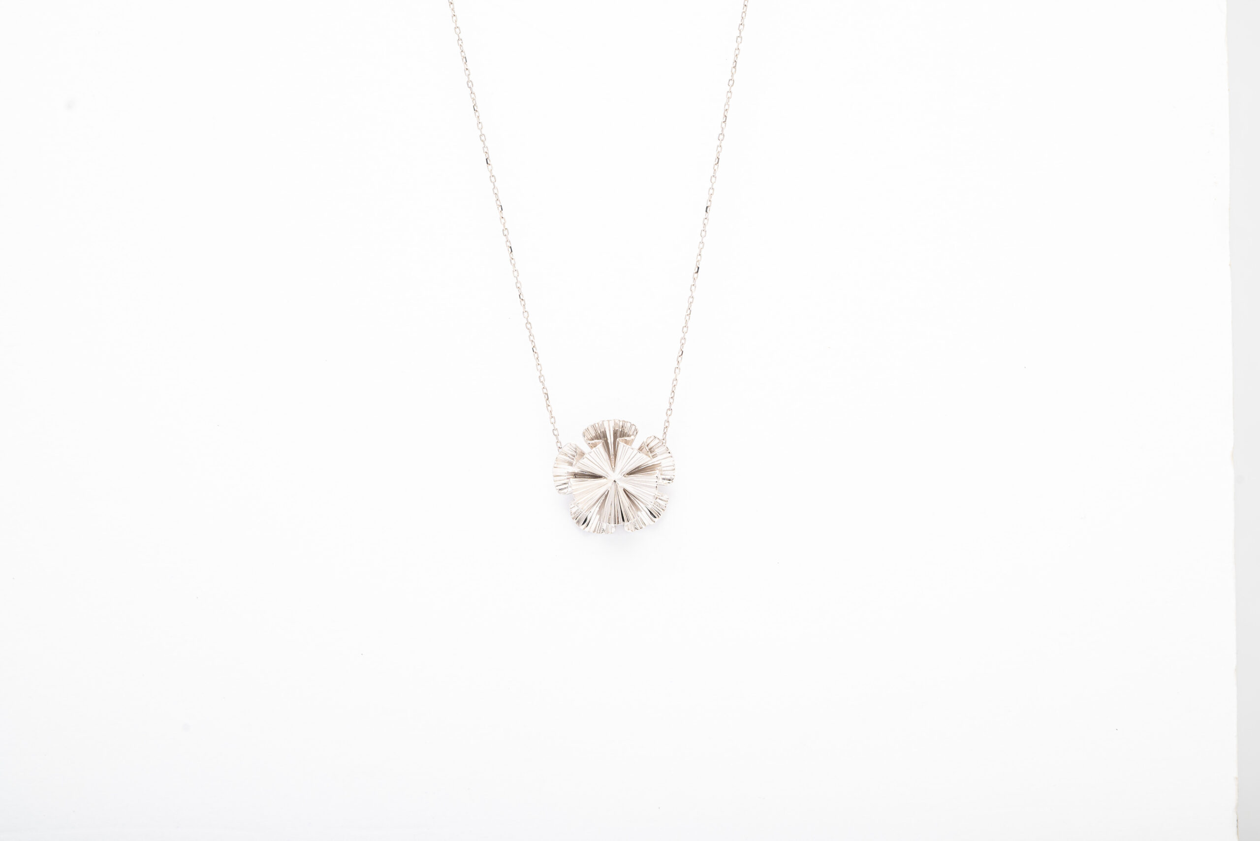 Forjado em ouro branco 18K, o pingente delicadamente preso à corrente transmite força com suavidade — uma flor que resiste, floresce e brilha.