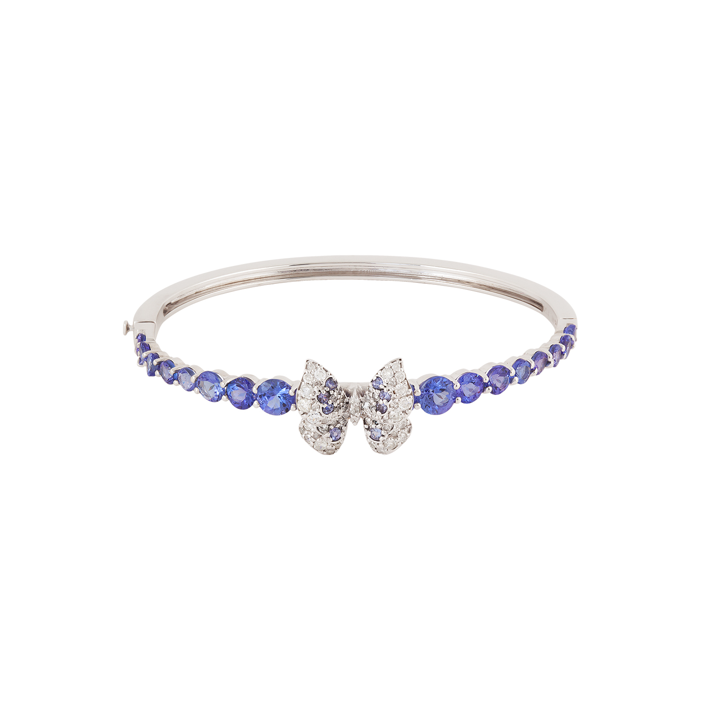 O Bracelete Butterfly é uma joia encantadora que une delicadeza e sofisticação. Em destaque, uma borboleta esculpida com precisão, adornada com brilhantes redondos em lapidação brilhante que criam um efeito luminoso. As laterais do bracelete são cravejadas com safiras azul.
