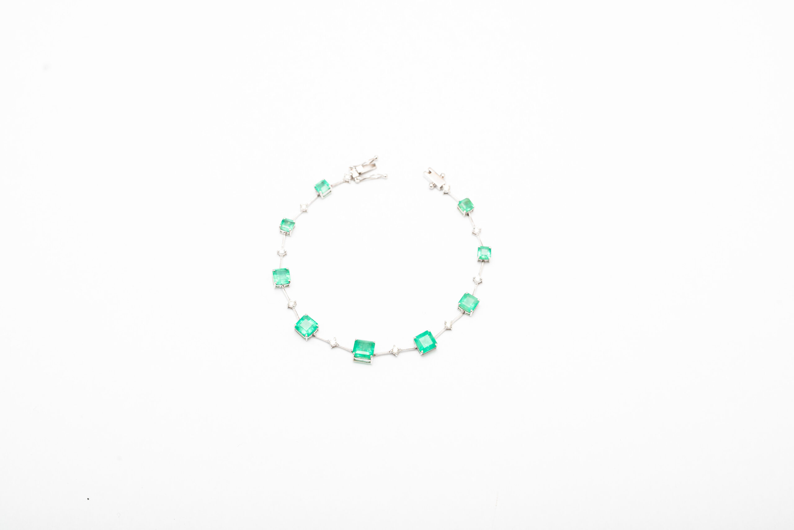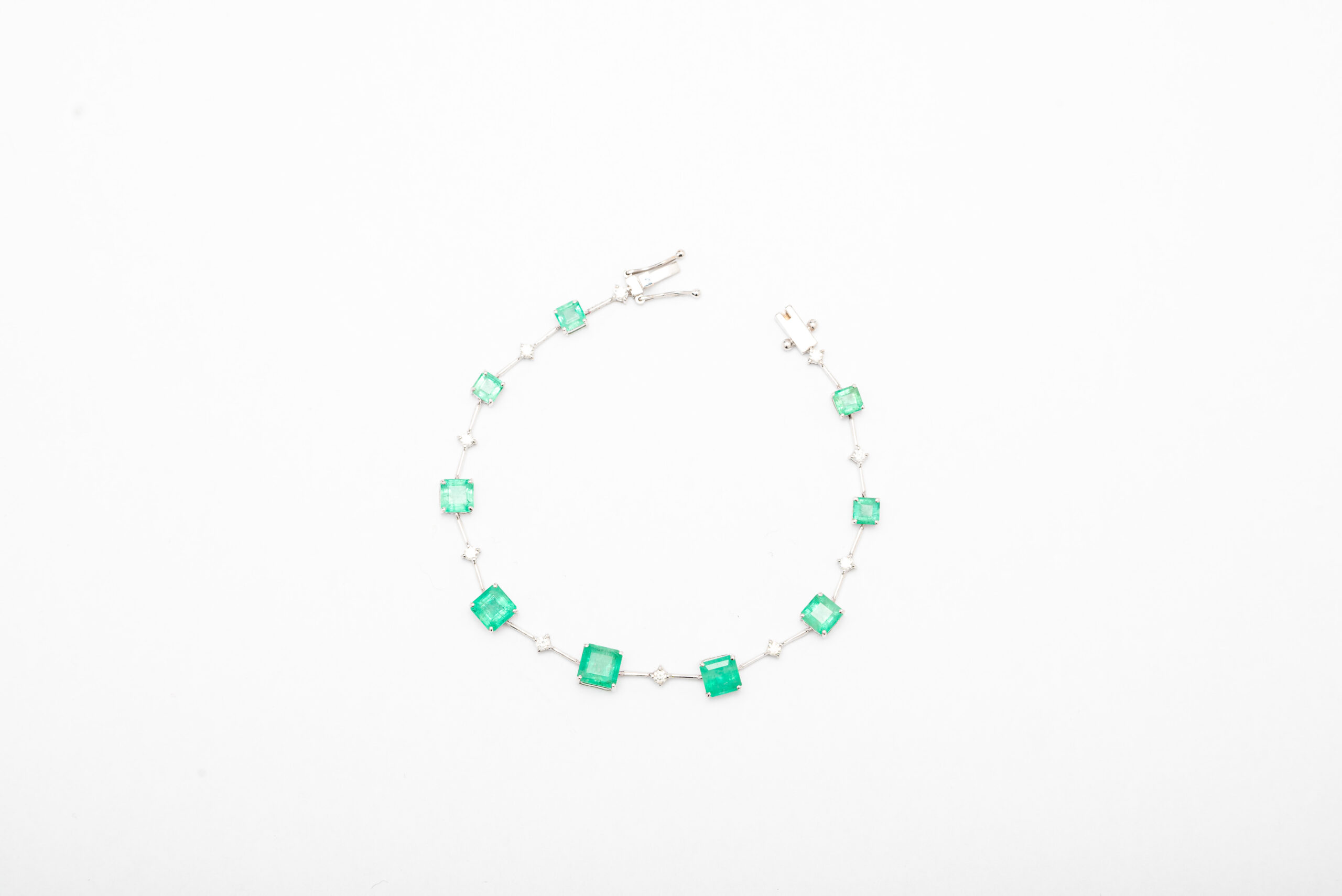 Uma joia deslumbrante que celebra o luxo atemporal das gemas mais desejadas do mundo. Esta pulseira apresenta uma sequência de esmeraldas lapidação esmeralda com tonalidade intensa, intercaladas por delicados diamantes, todos cravados em ouro branco 18K. O contraste entre o verde exuberante das esmeraldas e o brilho sutil dos diamantes cria uma harmonia visual cativante.